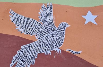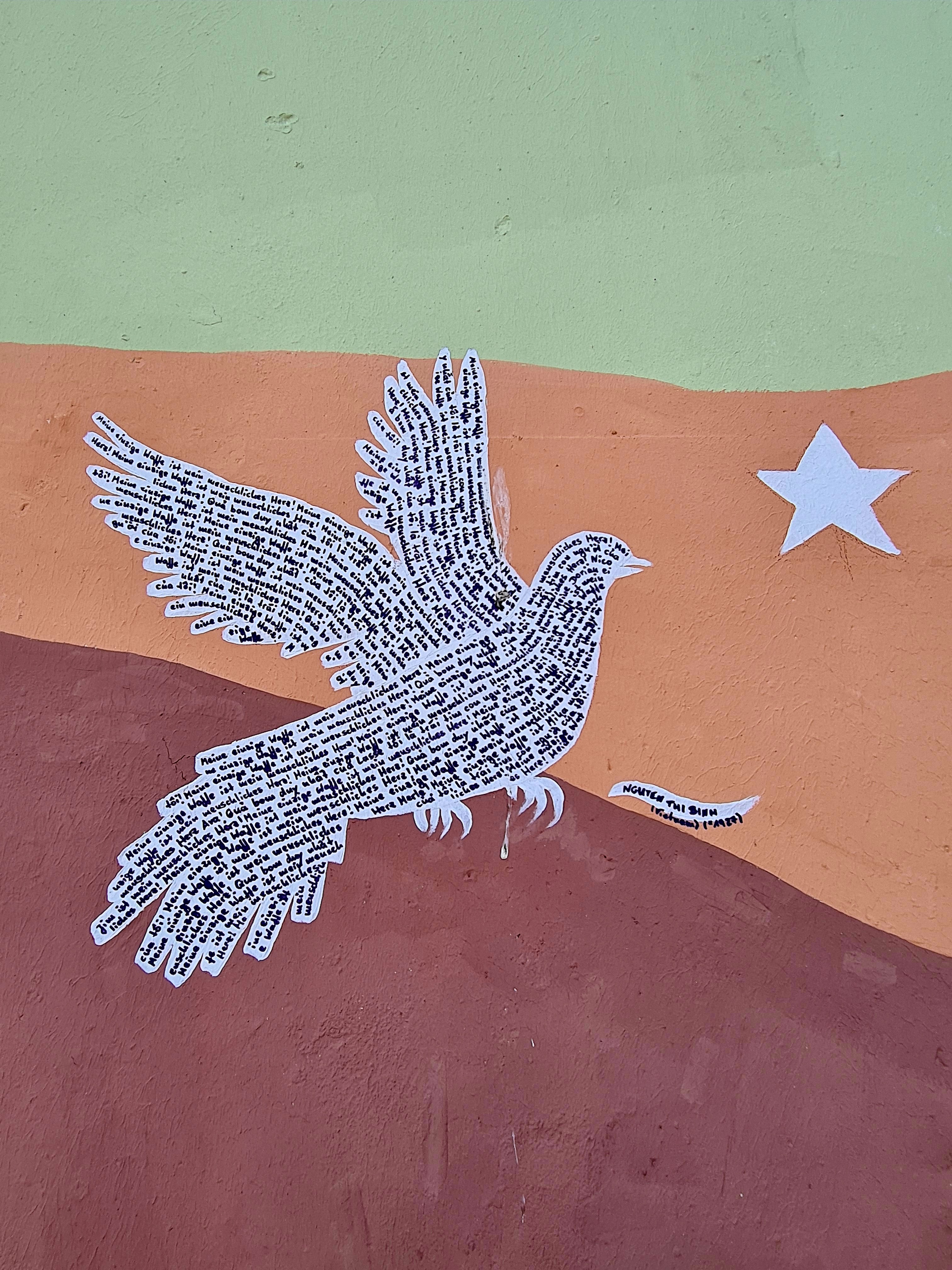 Das Wandbild zeigt eine Taube und einen Stern – Symbole für Vietnam und Bìnhs Bestreben, Konflikte durch Diplomatie zu beenden und nachhaltig Frieden zu schaffen.