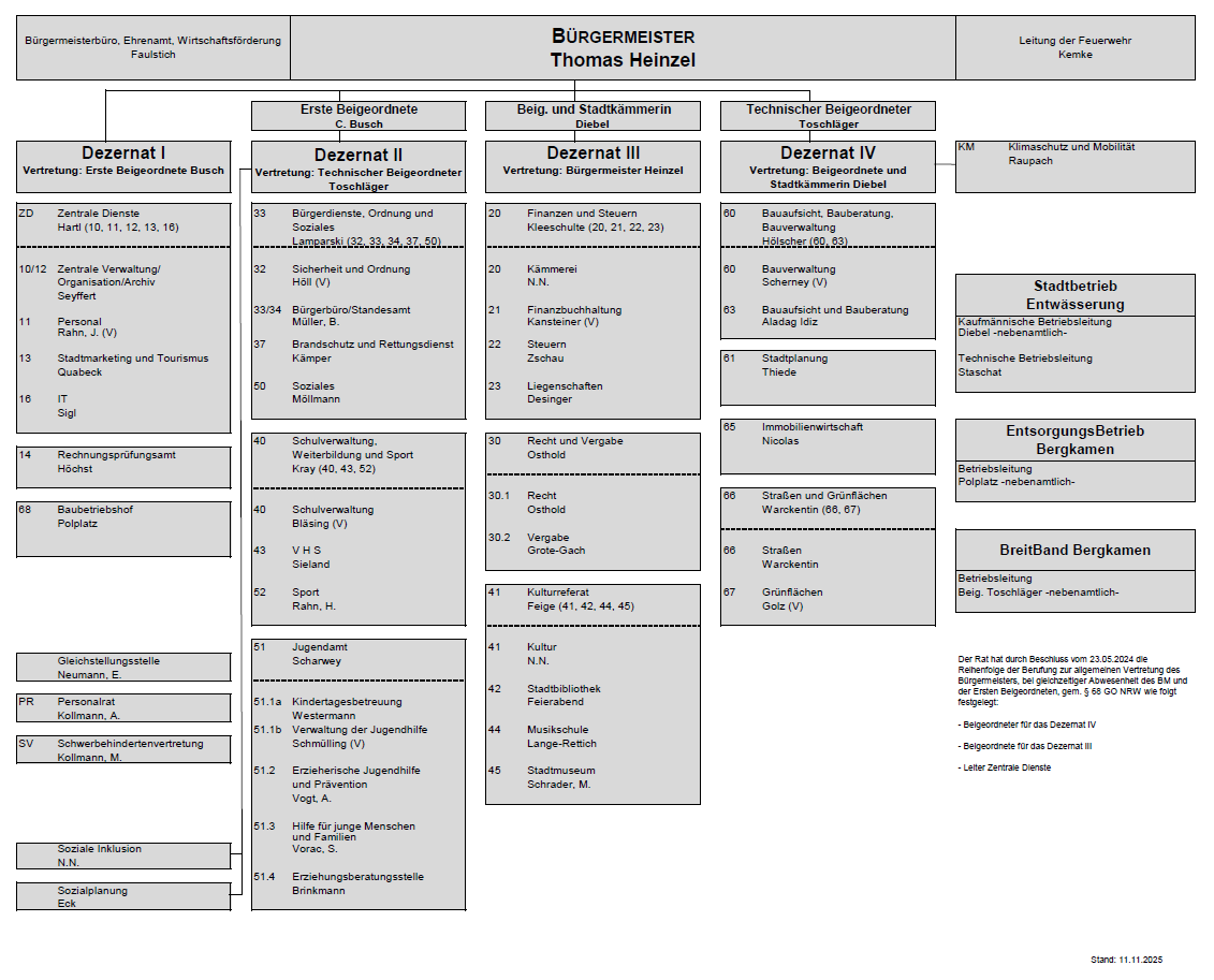 Hier finden Sie den Organisationsaufbau der Stadtverwaltung Bergkamen sowie die Lebensläufe der Mitglieder des Verwaltungsvorstandes.