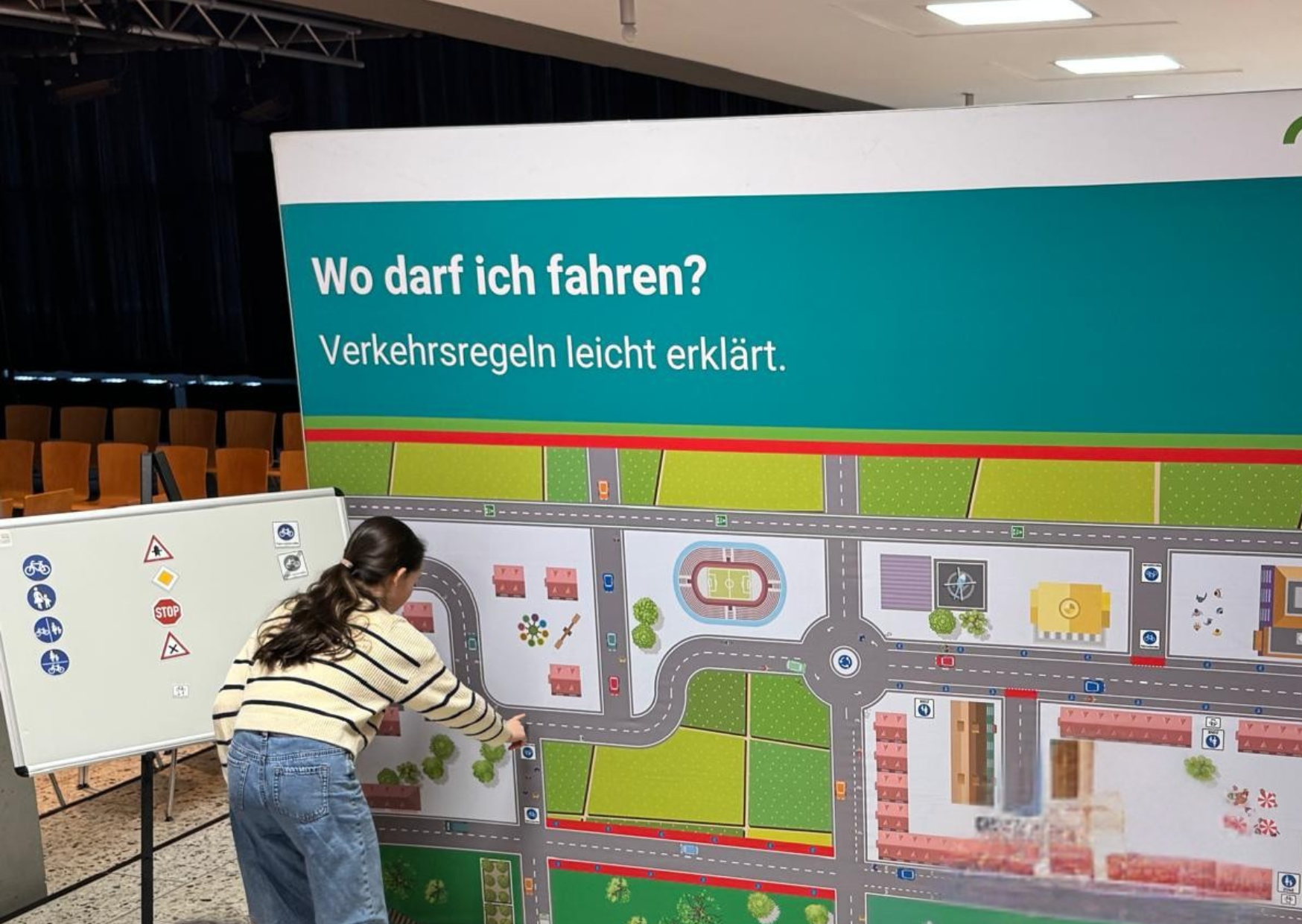In mehreren Modulen konnten die Schülerinnen und Schüler typische Alltagssituationen aus der Perspektive von Radfahrenden erleben und ihre Reaktionsfähigkeit testen. Ergänzend wurden wichtige Verkehrszeichen mit Bezug zum Radverkehr spielerisch anhand einer Karte vermittelt. Ein weiteres Modul beschäftigte sich mit reflektierenden Materialien und deren Bedeutung für die Sichtbarkeit im Straßenverkehr. Zum Abschluss erhielten die jeweils reaktionsschnellsten drei Teilnehmenden pro Klasse eine Warnweste, alle anderen einen reflektierenden Smiley.