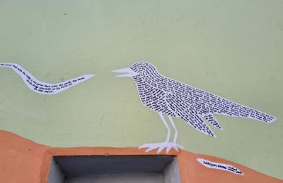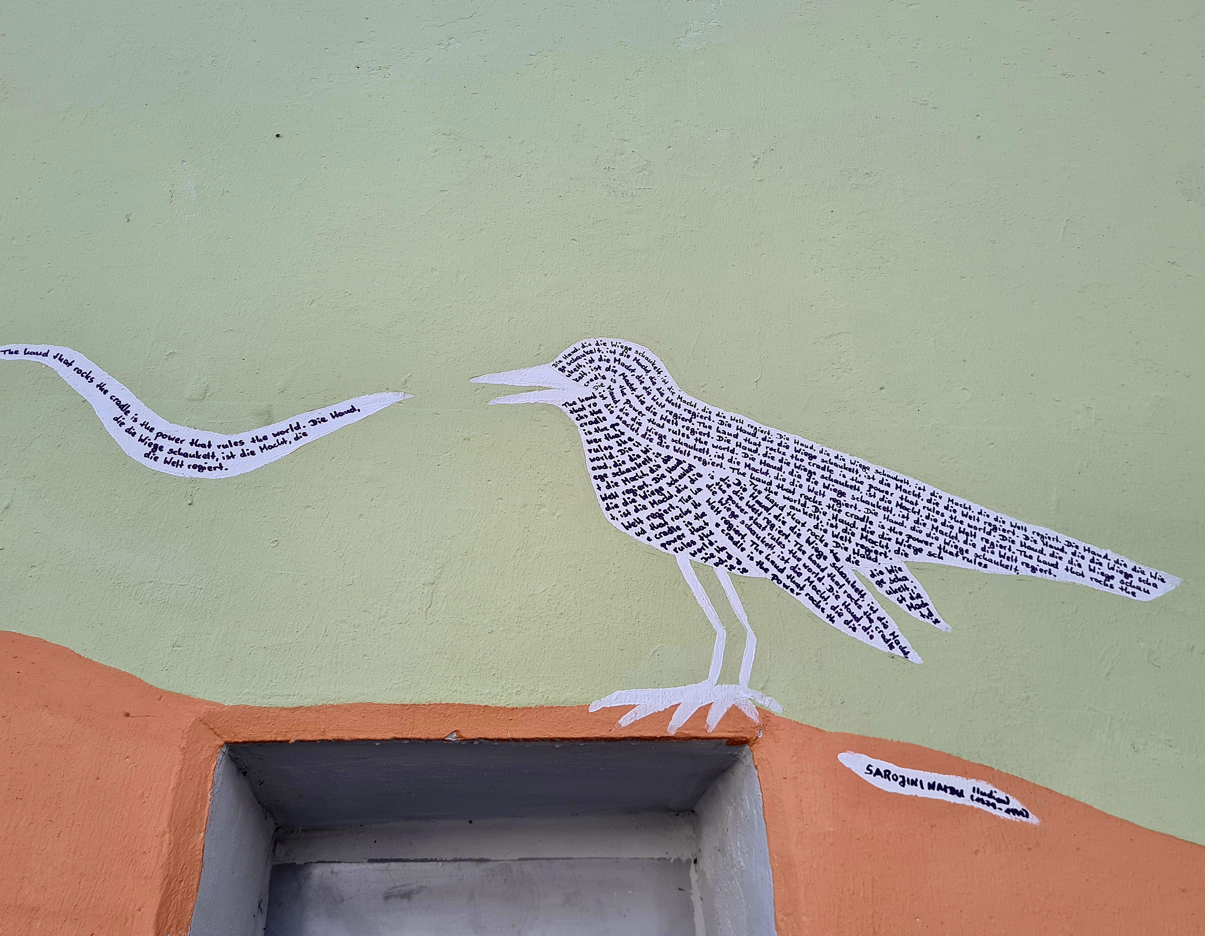 Das Wandbild zeigt eine Nachtigall – ein poetisches Sinnbild für Sarojini Naidus eindrucksvolle Lyrik, die ihr den Ehrentitel „Nachtigall Indiens“ einbrachte.